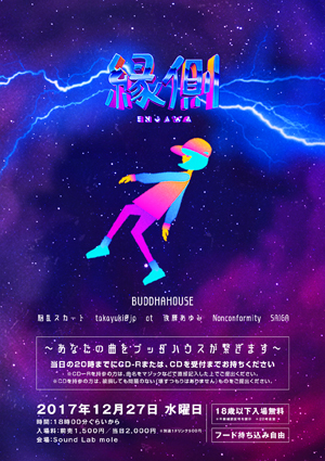出演者:脳乱スカート / takayuki@jp / ot / 後藤あゆみ / Nonconformity / SAIGA当日の20時までにCD-Rに曲を入れ曲名をCDRに直接、油性マジックで書くか破損しても問題のないCDをそのまま受付までお持ちください