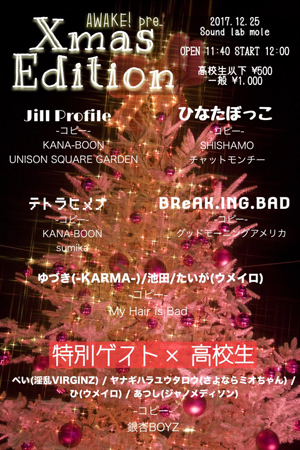 高校生以下¥500/一般¥1,000出演:Jill Profile / ひなたぼっこ / テトラヒメナ / BReAK.ING.BAD / ゆづき(-KARMA-)、池田、たいが(ウメイロ)